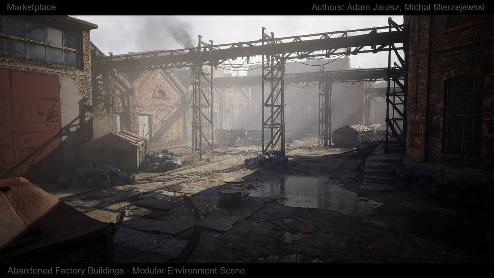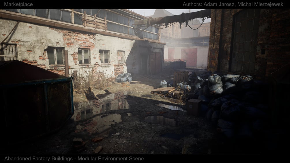 Abandoned buildings in the middle of the old factory. The scene contains highly detailed objects like modular elevations, contains bricks, pipes, pallets, trash bags, and many more to build such a district. Most assets were built based on photogrammetry technique and properly optimized and hand-tweaked to work in real-time scenes on UE4/UE5. There were prepared two lighting setup day and night. This pack includes a mannequin by Epic Games for presentation.