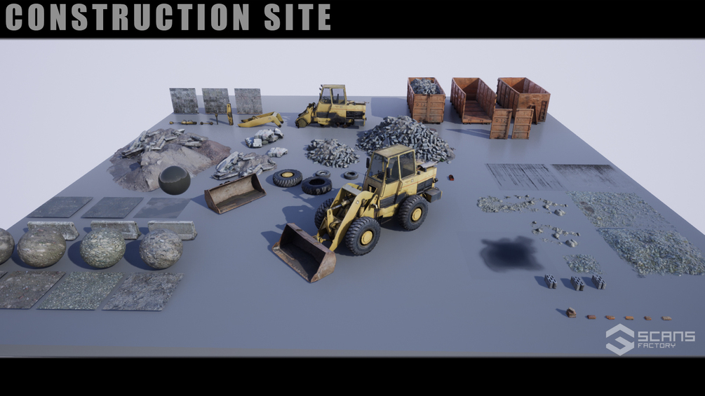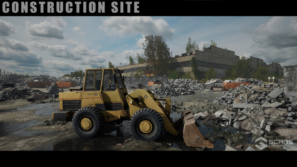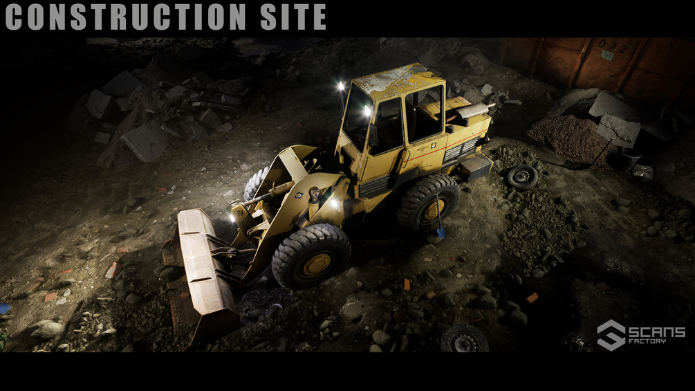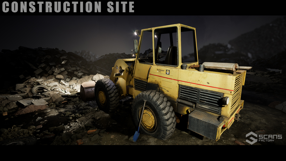 Construction site environment with driving front-end loader. The Loader has moving parts and its wheels deform the landscape. You can move the spoon up and down and eject its contents. You can activate the lamps or the brake with buttons. Loader based on a scanned photorealistic vehicle - parts have changed and have been adapted to our version. In addition, you have objects to build a destroyed environment.