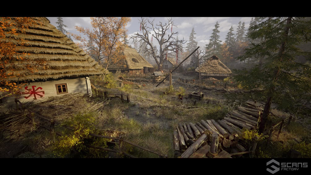 • Authentic Slavic Architecture and detailed props: Include a range of thatched-roof huts, wooden barns, and storage sheds, crafted to reflect traditional Slavic building styles. Feature realistic elements like woodpiles, fences, carts, and small storage areas to bring the village to life with lived-in authenticity.