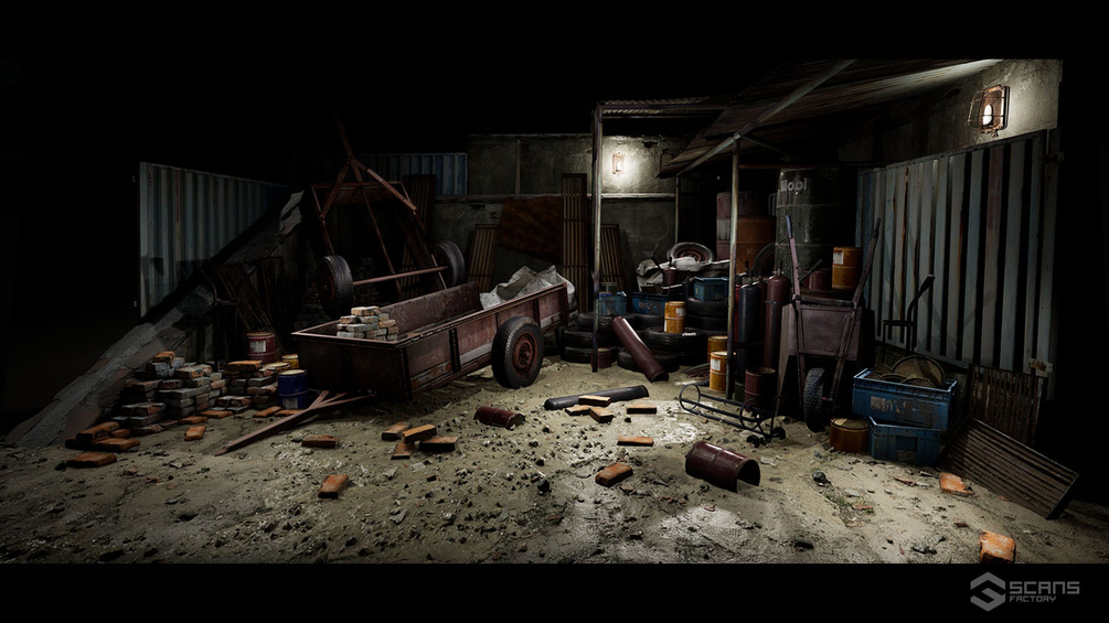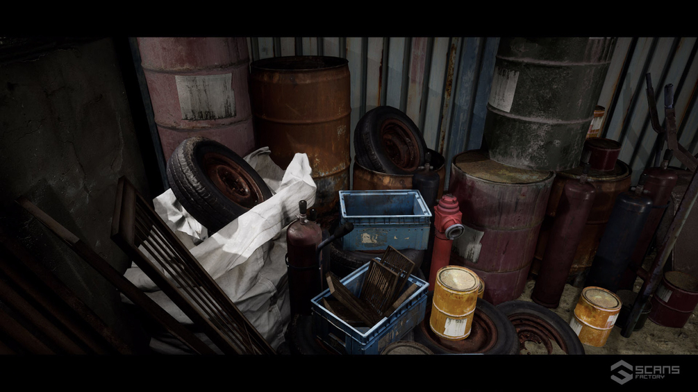 Photogrammetry realistic props: fuseboxes, water tank, trashcan, container, wooden spool, manhole, trashbag, wood pallet, bricks.